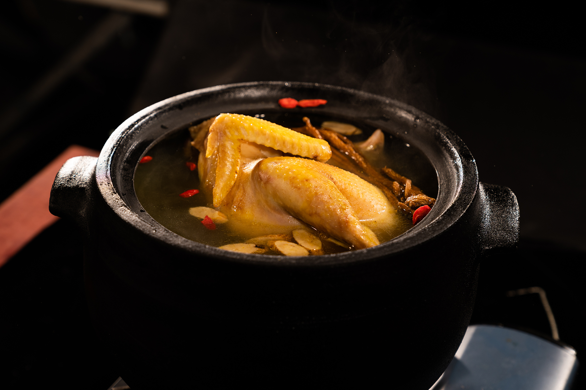 锅中加入鸡块、生姜及清水2L,大火煲开后改用文火煲继续煲45分钟。