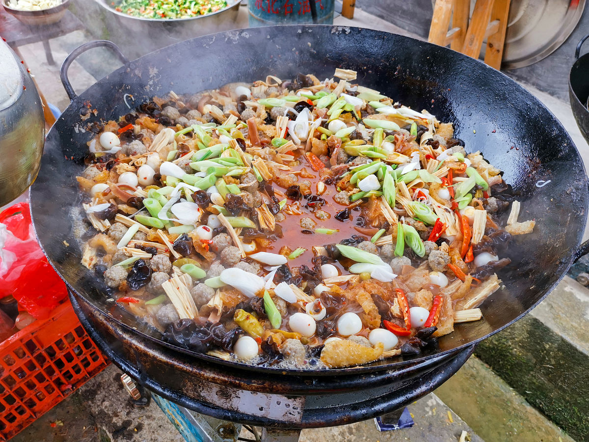 在烹饪时,使用大锅和铁锹作为炒菜工具,将油倒入热锅中,放入葱、姜、蒜、八角等香料炒香。然后将煮白肉片和小酥肉等主料放入锅中煸炒,再陆续加入配菜和调料,如白菜、炸豆腐、腐竹、木耳、蒜苗等。根据需要加入老抽、料酒、食盐等调味料,并适量加水煮炖,使食材充分吸收汤汁入味。